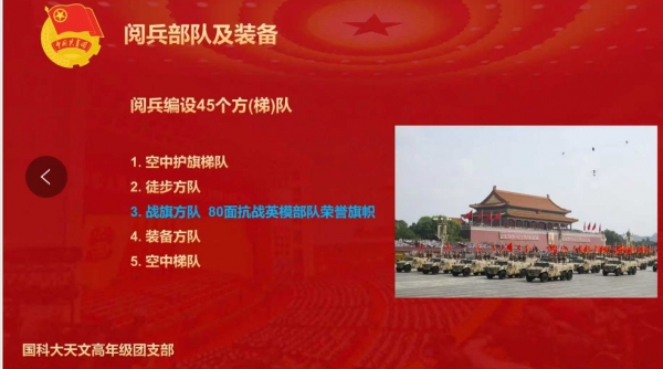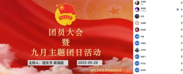 2025年9月28日星期日下午17:00,中国科学院大学天文与空间科学学院高年级团支部于及线上组织开展了团员大会暨九月主题团日活动。本次活动由天文与空间科学学院高年级团支部书记袁海超同志主持,天文与空间科学学院高年级团支部团员与非团员青年参加本次活动。本次介绍了支部构成与日常工作,并围绕抗战胜利80周年纪念活动展开主题学习。
