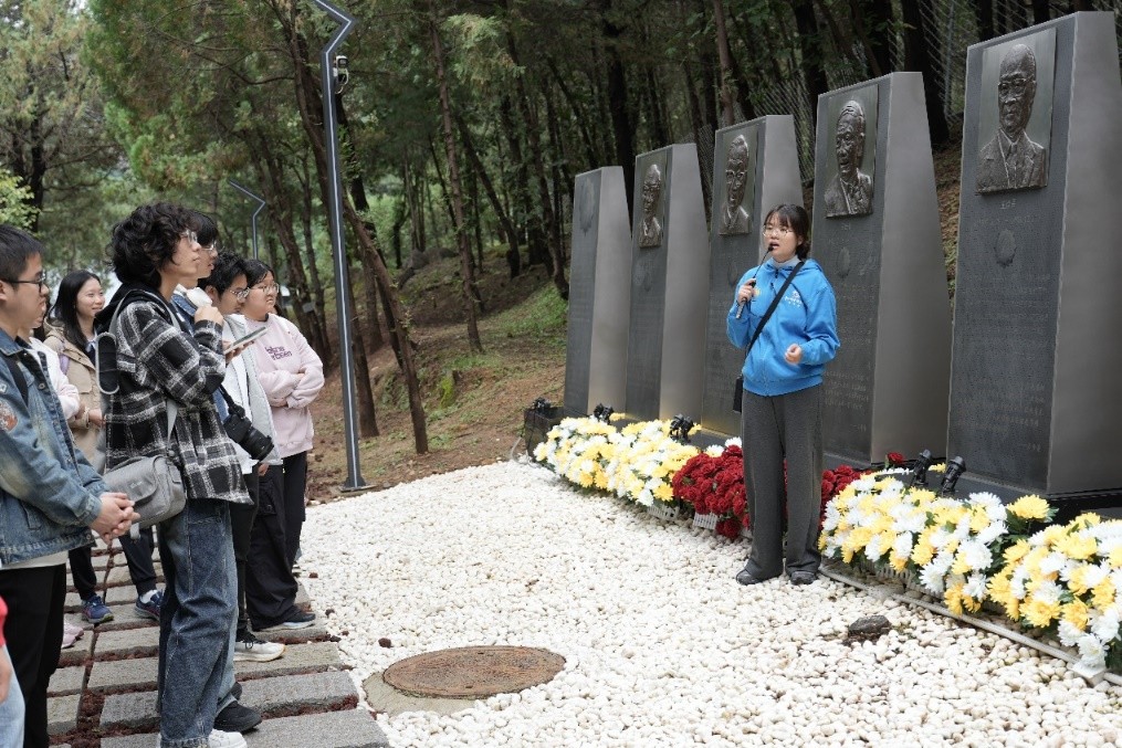 离开展馆后,大家沿着校区内的“功勋路”缓步前行。这条路左侧矗立着“两弹一星”元勋的雕像,彰显着他们为祖国科技事业无私奉献的崇高精神。讲解员逐一介绍了每位元勋的生平与主要成就,同学们怀着崇敬之情驻足瞻仰,感受着那段波澜壮阔的科研岁月,体悟着深厚的家国情怀。